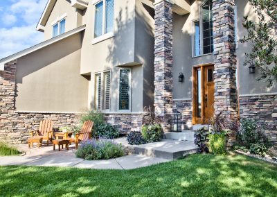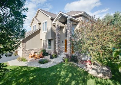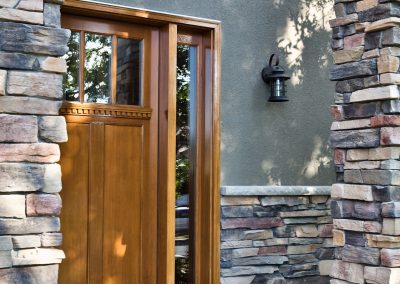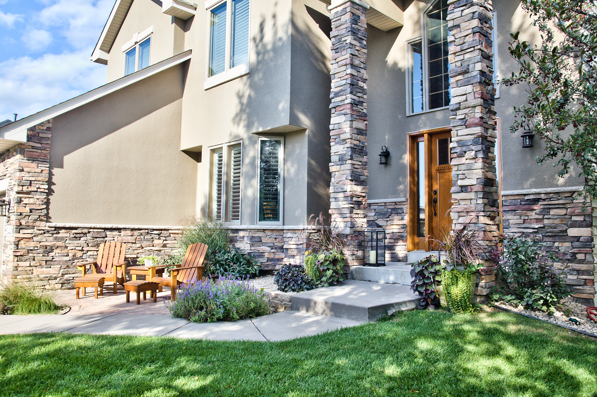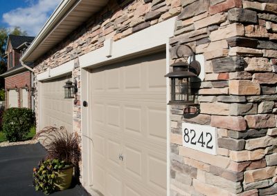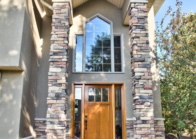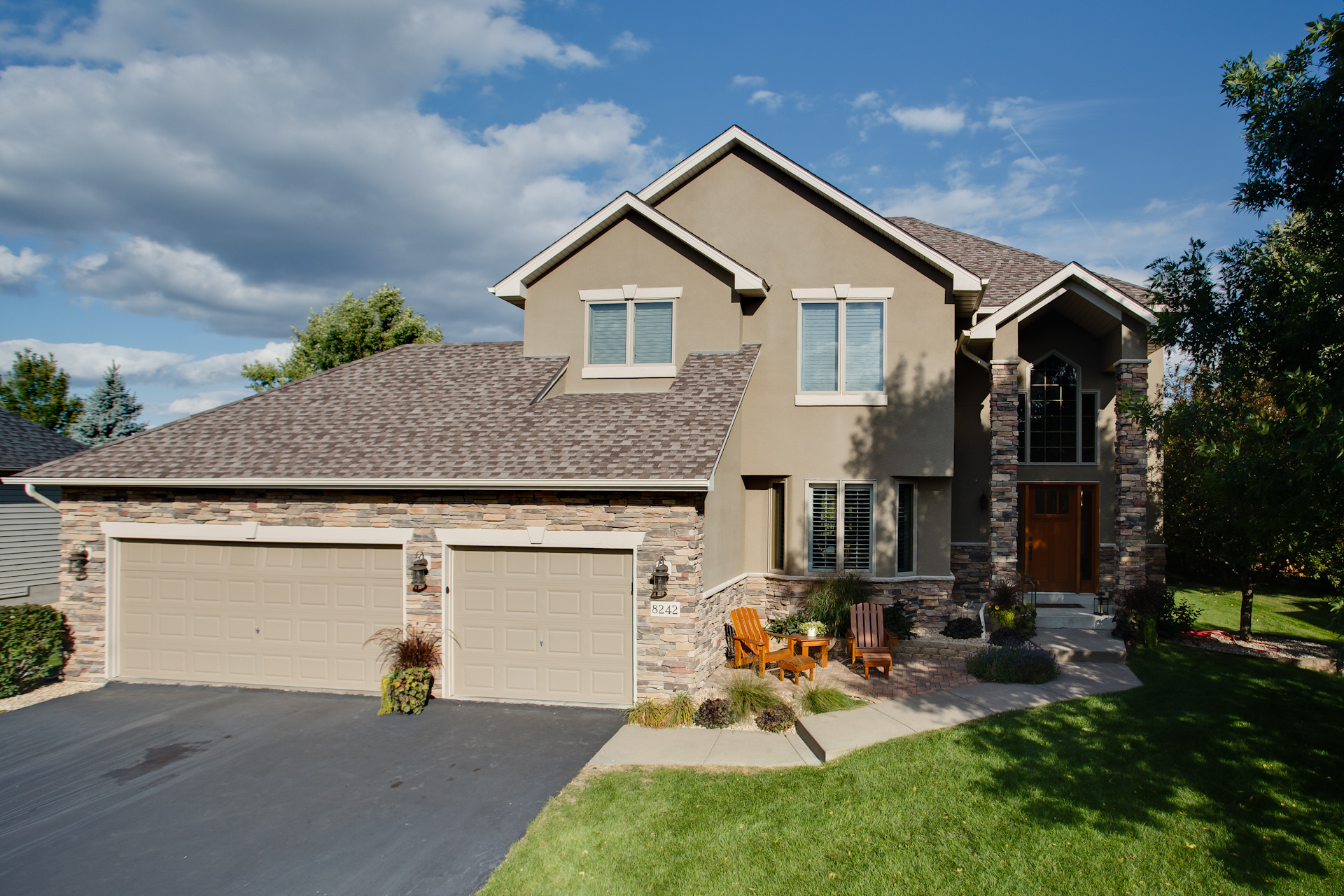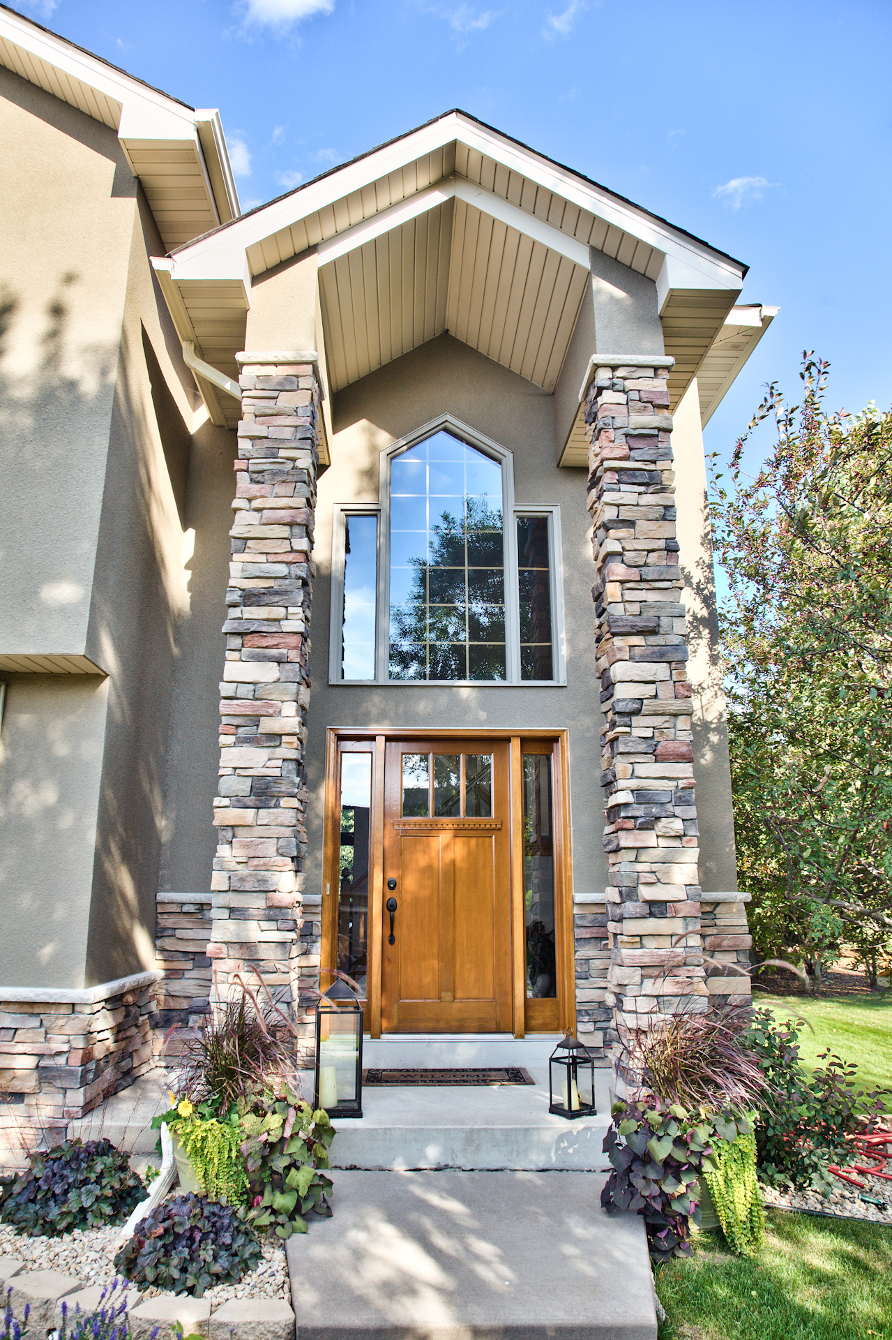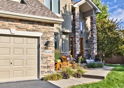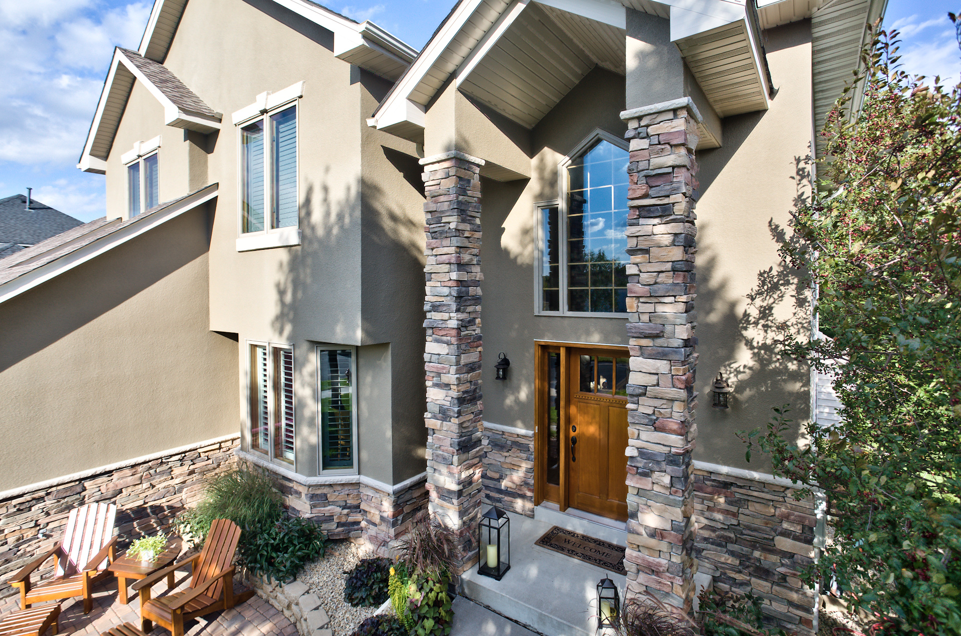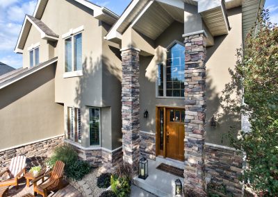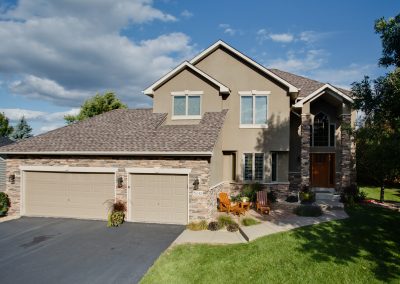 Facelift with Stone & New Front Entry Maple Grove, MN. The homeowners needed minor stucco maintenance, installing kick outs flashing and caulking and sealing. To increase curb appeal, we installed a new front door, added veneer stone and paint to cover up the monotone off-white stucco.