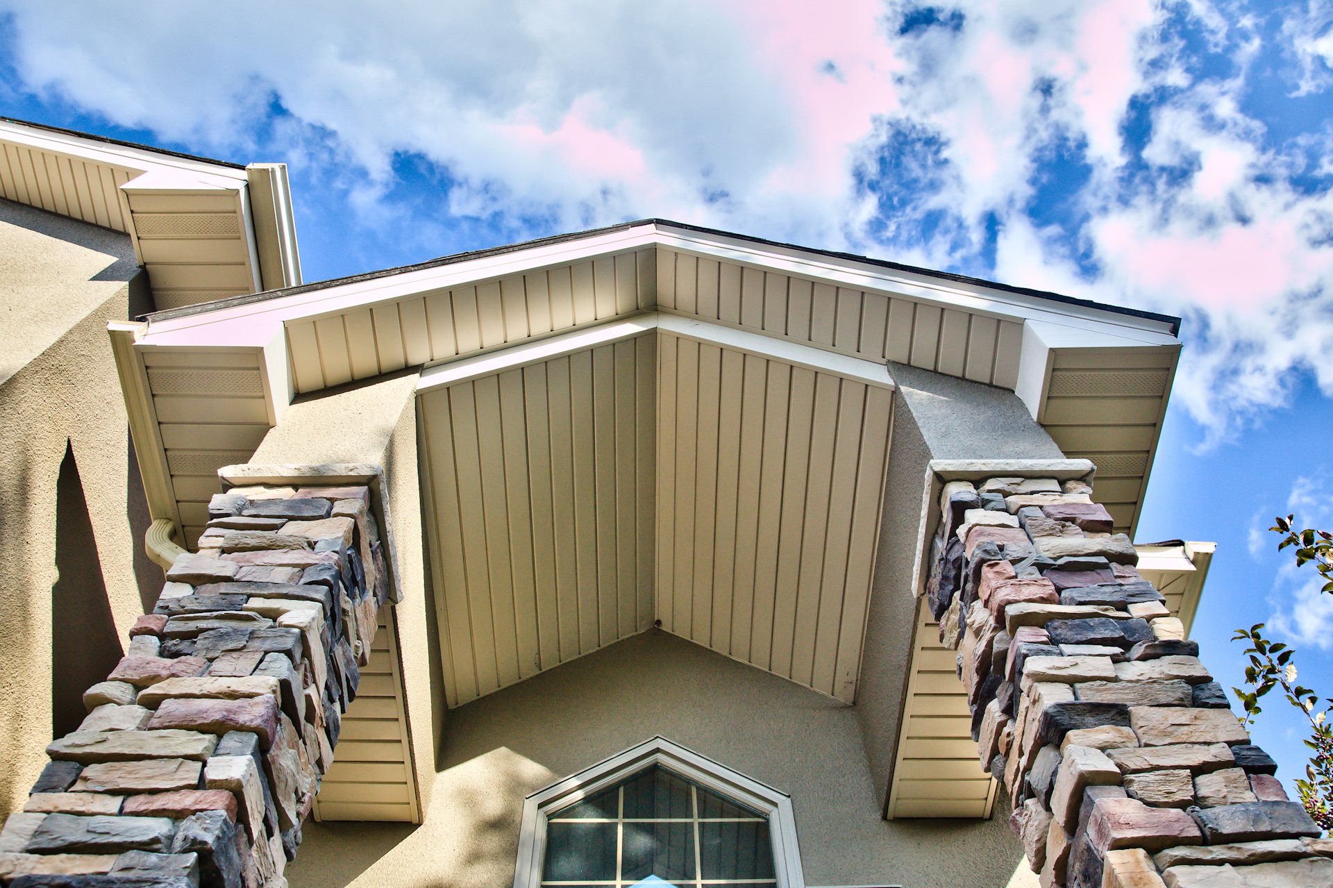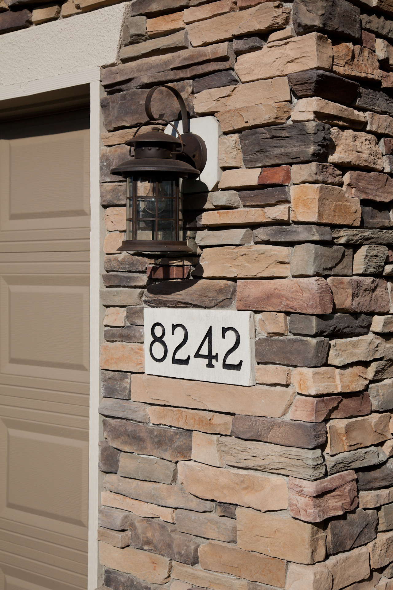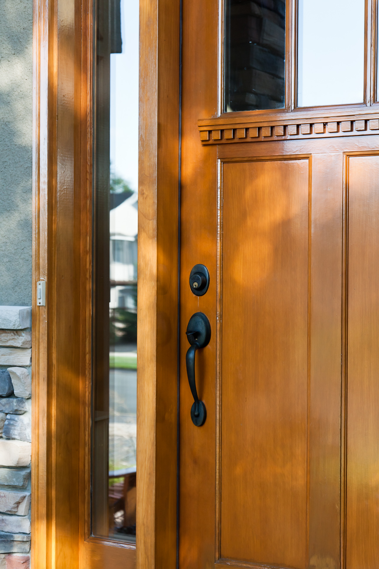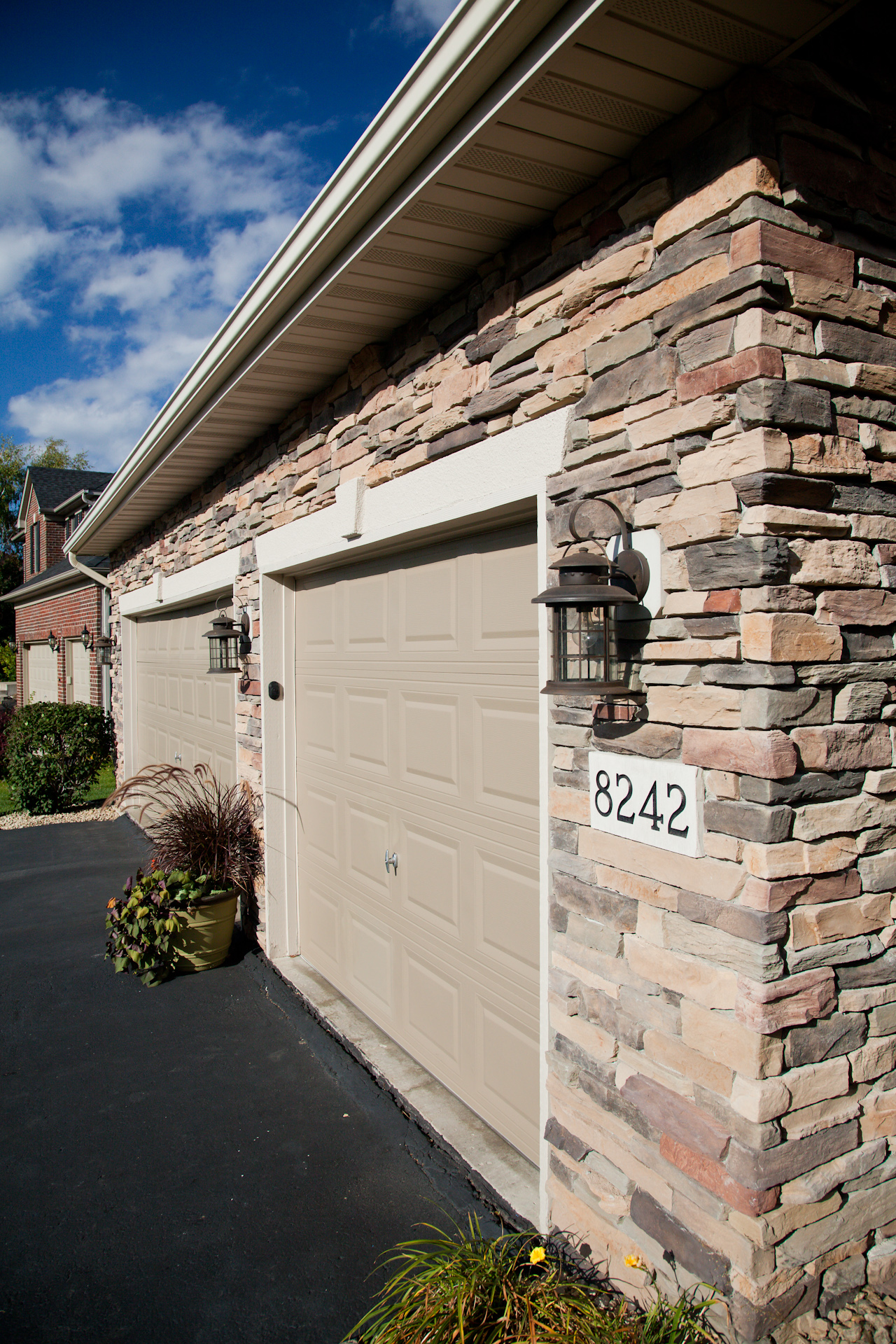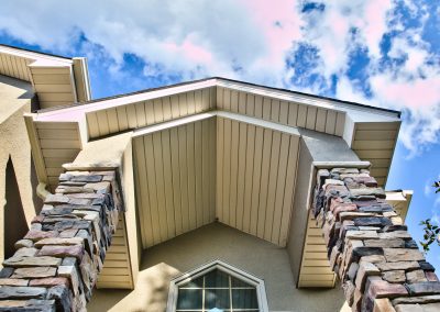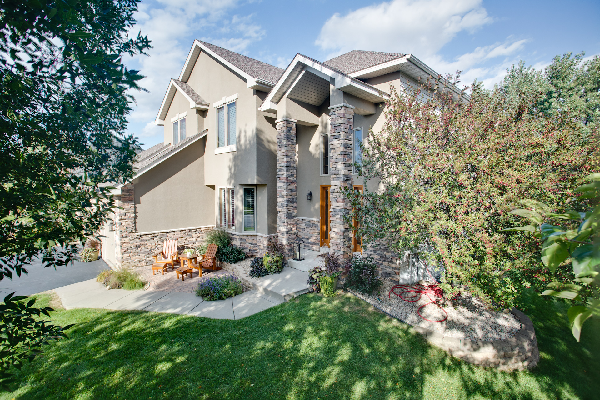 Facelift with Stone & New Front Entry Maple Grove, MN. The homeowners needed minor stucco maintenance, installing kick outs flashing and caulking and sealing. To increase curb appeal, we installed a new front door, added veneer stone and paint to cover up the monotone off-white stucco.